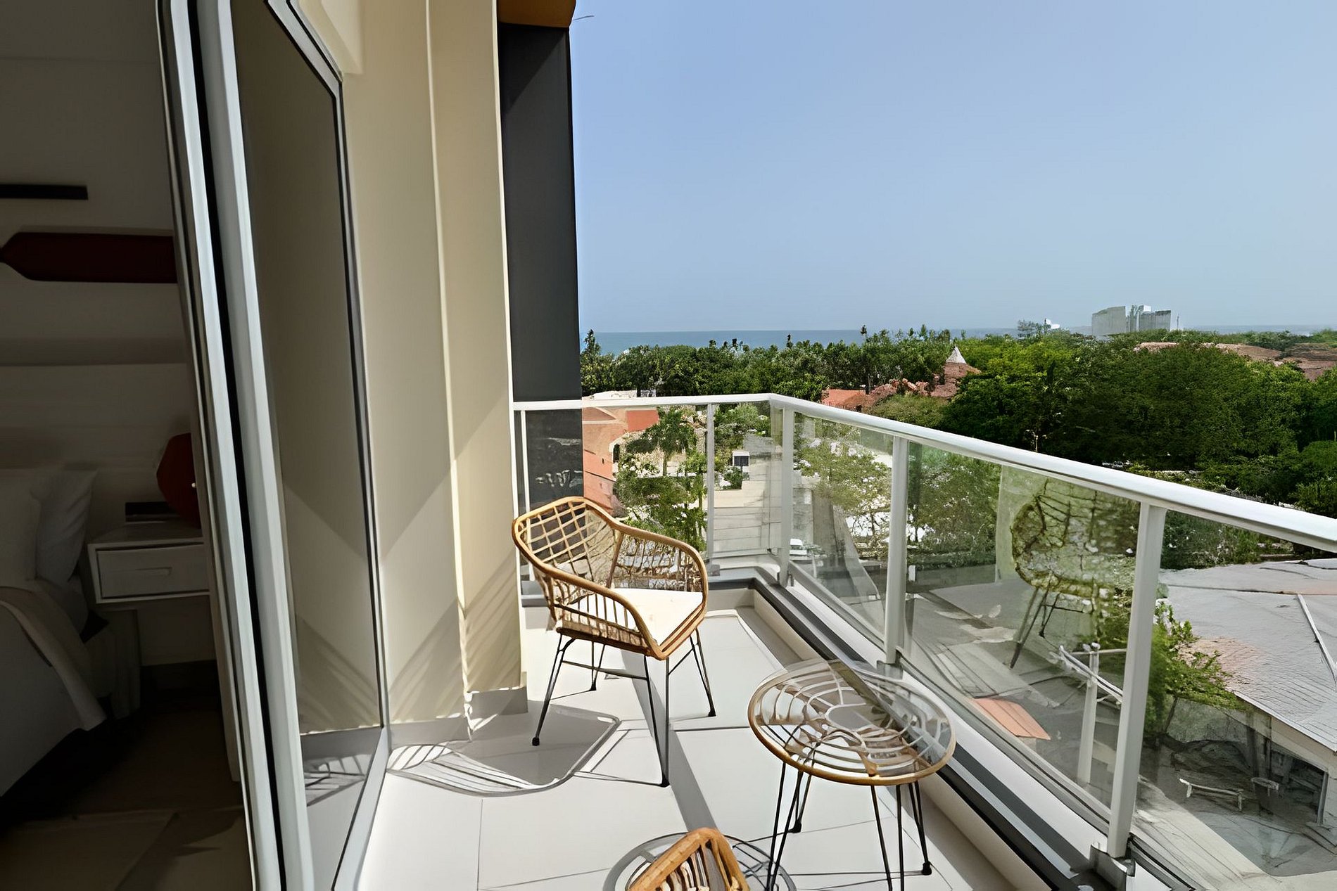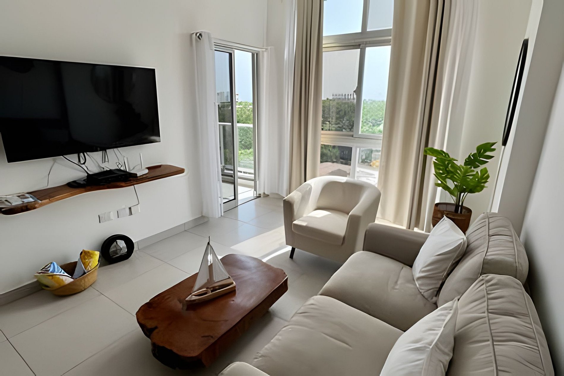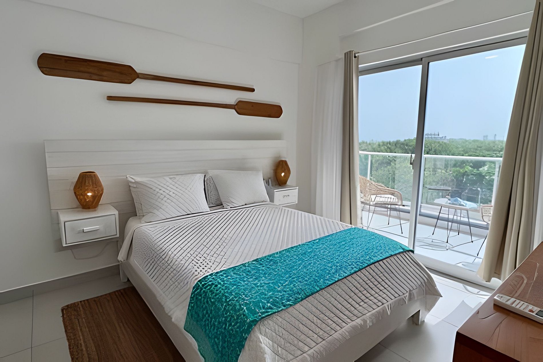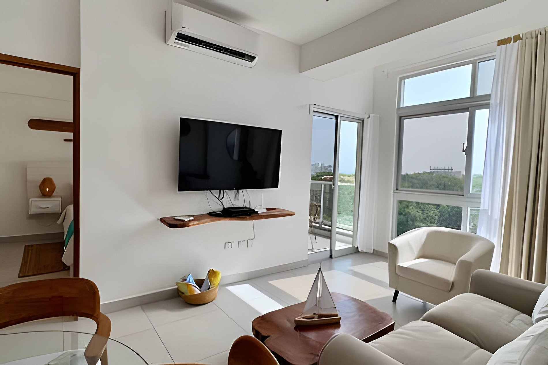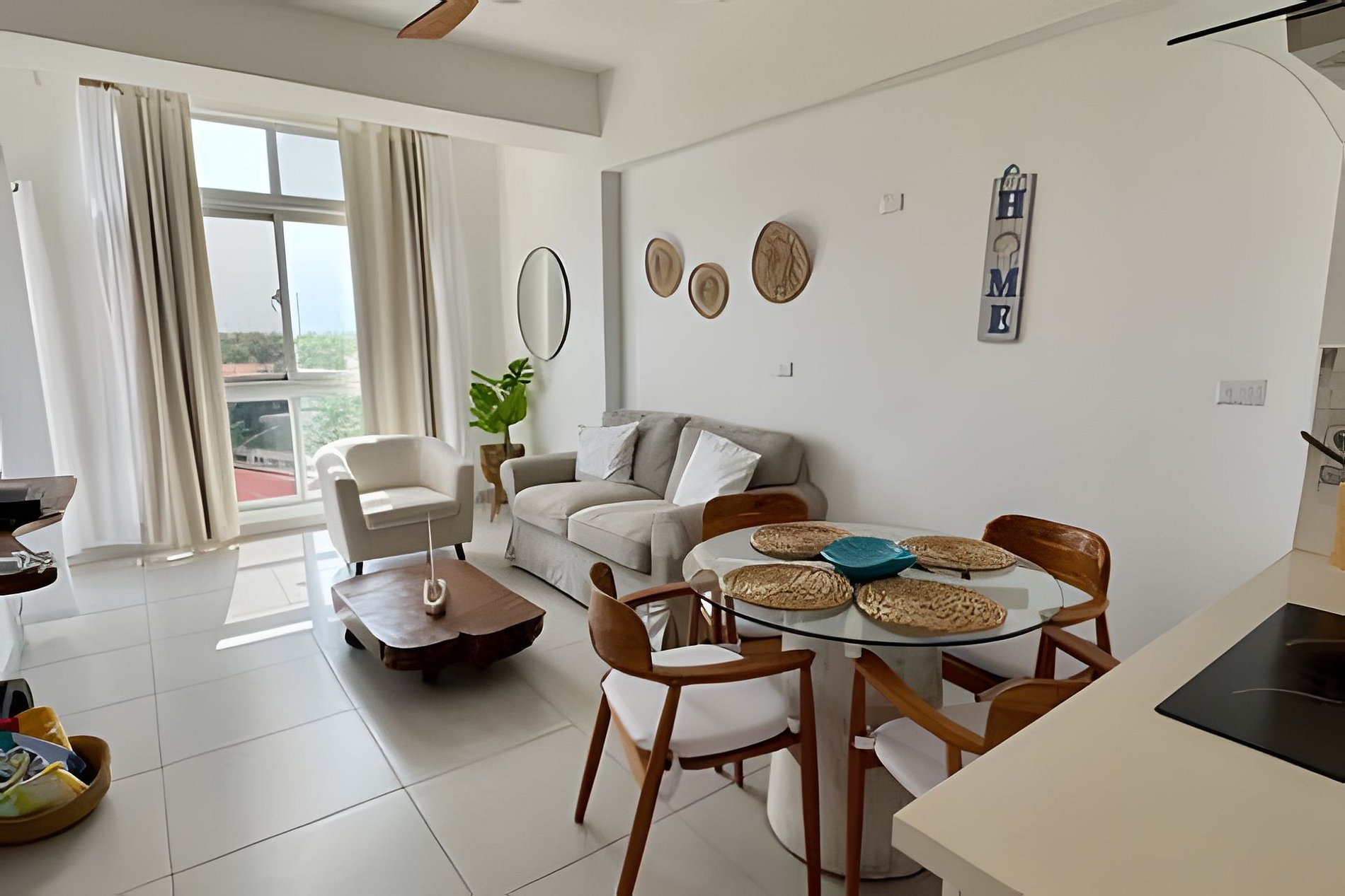 A spacious, bright, and comfortable one-bedroom apartment, ideal for your dream vacation for two. Every detail and decorative element has been designed to convey peace, relaxation, and comfort, without detracting from the spectacular views through its large windows. This accommodation features fully integrated spaces in an open-plan design, where you can share time while engaging in various activities, such as preparing delicious meals in the fully equipped kitchen, watching a movie on the sofa, or enjoying the warm Caribbean breeze from your spacious balcony, all while enjoying the views of the splendid sunsets over the waves of the Caribbean Sea.
